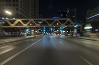 This is a blurred photo taken at night in downtown Chicago, Illinois. The image captures the city's modern architecture and urban design, with straight lanes and highways. The photo shows the motion blur created by the passing of vehicles over the asphalt roads. The roadway lights and street lights illuminate the concrete streets, creating streaks of light. This image represents the vibrant city life and the metropolis atmosphere of Chicago.