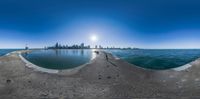 A stunning cityscape of Chicago at dawn, with the city skyline reflected on the calm waters of Lake Michigan. The clear sky and sunny weather enhance the modern architecture along the coastal pier.