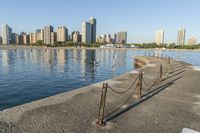 A view of the Chicago cityscape from a pier along the coast of Lake Michigan. The concrete streets and buildings blend with the urban skyline. The river and harbor offer recreational pathways for the city dwellers.