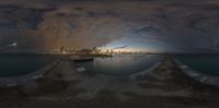 a panorama fisheye photo with a city in the back ground and the water below it