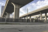 This stock photo captures the cityscape of Chicago, Illinois, USA. The image showcases the urban infrastructure of the metropolitan area including buildings, roads, and bridges. The photo was taken during the day and features a concrete bridge and an underpass. The cityscape includes the iconic Skyway and a gas station. The downtown area is visible in the background. The surface of the road is made of asphalt and there are contrails in the sky. The image also shows a parking deck and an industrial factory. The photo represents the bustling city of Chicago and its transportation and industrial sectors.