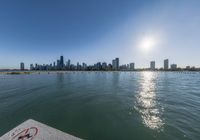 the city of chicago with skyscrapers and water in foreground on a clear, sunny day