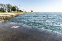 A sunny day in Chicago, Illinois with a picturesque coastline and crystal clear water. The cityscape and skyline are visible in the background, creating the perfect vacation spot. Enjoy the nature and relax on the beach or take a walk along the concrete path.