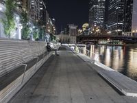 This captivating photo showcases the vibrant cityscape of downtown Chicago, Illinois, USA at night. The modern architecture and iconic skyline reflect the bustling metropolitan area. The city lights beautifully illuminate the river flowing through the urban landscape. Amidst the hustle and bustle, a walkway lined with trees leads to a recreational park, providing a touch of nature in the midst of the metropolis. This image perfectly captures the combination of urban and natural elements that define Chicago, showcasing its vibrant city life and its connection to nature.