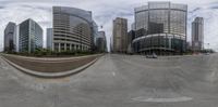 a round image of a modern city with skyscrapers and a person skateboarding on the road