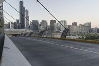 A stunning skyline of Chicago, Illinois at dawn. The city's iconic skyscrapers and suspension bridges are highlighted against a clear sky. The urban metropolis is reflected in the low-lying asphalt roads and highways.