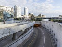 A view of a straight road in Chicago, Illinois. The road leads to a concrete bridge with a guard rail, showcasing the city's iconic architecture. Clouds fill the urban skyline. Elevated highway ramps create a unique cityscape.