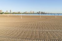 A clear sky overlooks the coastal city of Chicago in Illinois, USA. The open spaces and walkways along the shore invite tourists and locals alike to enjoy a day by the water. The sandy streets provide a unique and recreational surface for beachgoers.