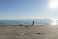 A sunny day in Chicago, Illinois, with a coastal road parallel to a beautiful beach. The open space provides a perfect view of the ocean and the shoreline. Take a peaceful walk along the concrete path and relax on the pier while enjoying the waves.