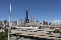 This is an image of the stunning skyline of downtown Chicago, Illinois, in the United States. The clear sky above highlights the city's skyscrapers and high-rise buildings, showcasing its impressive architectural prowess. The bustling urban metropolis is filled with open spaces and a well-connected transport system. This photo captures the essence of a vibrant day in Chicago, where the cityscape contrasts with the surrounding open spaces. It represents the beauty and dynamism of this iconic American city.