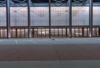 A night view of a modern office building in the business district of Chicago, Illinois. The city lights illuminate the surface of the asphalt parking lot. The profile of the building stands out against the dark sky.