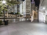 This is an image of the cityscape of Chicago, Illinois, USA. The view captures the city at night, with the modern architecture of high-rise buildings lining the river. A walkway runs alongside the river, providing a path for pedestrians to explore the city. The city lights illuminate the buildings and create a beautiful reflection on the water's surface. This photo showcases the urban metropolis of Chicago, with its skyscrapers, recreational open spaces, and the juxtaposition of nature and city life.