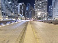 A captivating night view of Chicago's skyline. The concrete streets and straight roads lead to impressive skyscrapers. The city's architecture is accentuated by the glow of street lights and the artificial light that illuminates the metropolitan area.