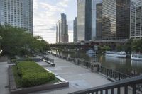a walkway with several planters, along a river that passes under the buildings in downtown chicago