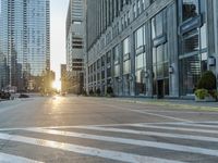 A picturesque view of Chicago at dawn with its iconic skyline and classic architecture. The sun is visible, casting a warm light on the city streets and buildings. A bustling urban metropolis filled with business districts and bustling neighborhoods.