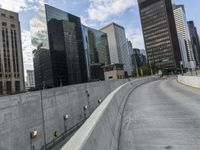 This is an image of the cityscape of Chicago, Illinois, USA. The photo captures the urban metropolis with its high-rise buildings and skyscrapers. The grey sky adds a dramatic touch to the concrete streets and highways. In the foreground, a road curves and leads towards the downtown area, with a bridge spanning over it. The image showcases the architectural beauty and bustling city life of Chicago. This photo represents the vibrant and dynamic atmosphere of one of the most iconic cities in the USA.