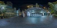 A stunning fisheye shot of Chicago's skyline at night, reflected in the river. The modern architecture and skyscrapers create a mesmerizing cityscape. The circular viewpoint adds a unique perspective to the urban design.