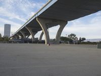 The Chicago Skyway, an architectural marvel in Illinois, spans across a parking lot filled with cars. The concrete bridge and box girder design create an urban cityscape. Contrails streak the open sky above, adding to the industrial atmosphere.