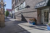 A view of an alleyway in Chicago's art district. The brick walls and concrete street create an urban aesthetic. Los sign and blue planters add a pop of color to the residential neighborhood.