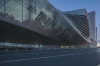 the modern buildings are surrounded by glassy and shiny windows and street lights for pedestrians