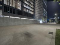 a concrete wall sits in an empty parking lot at night, illuminated by street lights