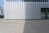 the building is made out of glass and silver sidings in front of the door is an exit