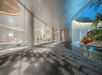a glass walled pool surrounded by an indoor garden filled with plants and flamingos near a pool in a modern mansion
