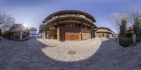 a circular lens photograph of a small building on a hill side street of china with its arched doorways