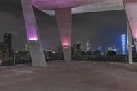 An overview of Shenzhen, China's modern architecture. The cityscape is illuminated by artificial lights, creating a vibrant purple glow. The concrete structure in the center stands out amidst the clear sky, showcasing the metropolitan area's urban charm.