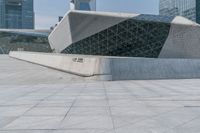 This is an image of a futuristic building in Guangzhou, China. The modern architecture features a geometric design on the front, reflecting the city's innovative and forward-thinking spirit. The clear sky above provides a striking contrast to the concrete surfaces of the building and the surrounding urban landscape. In the open space in front of the building, two people are seen walking together, adding a human element to the scene. This photo represents the modern cityscape of Guangzhou and its vibrant urban atmosphere.