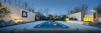 A suburban villa in China illuminated by artificial lights at night. The courtyard is adorned with flowers, creating a welcoming and comforting atmosphere. Clear skies above hint at a peaceful and serene night.