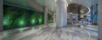 large glass walled lobby next to a stone column filled with furniture and art work of art