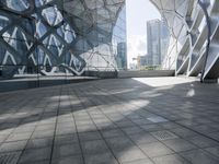 A modern architectural marvel in Shenzhen, China. The futuristic design and abstract lines create a stunning skyline. The building's glass exterior reflects the surrounding cityscape, while the hard shadows add depth.
