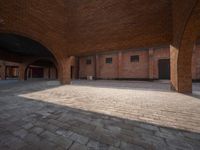 A classic architecture arcade in Shanghai, China. Brown brick walls and cobblestone streets create an industrial urban vibe. Open spaces with concrete flooring and hard shadows reflect the city life. Urban design meets art district charm.