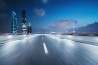 This is an image of a cityscape at night in Shanghai, China. The modern architecture and skyline are illuminated by the artificial light, creating a beautiful view. The asphalt road leads straight ahead, with cars creating a motion blur effect. In the distance, the Armco barrier and bridge can be seen. The city is bustling with activity, as captured in this overview of Shanghai at night. This photo represents the urban and dynamic atmosphere of the city.