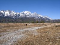 This is an image of a road in the highlands of China, surrounded by a beautiful mountain landscape. The dirt road stretches through the wilderness, passing by cliffs and villages with historic architecture. The grass surface contrasts with the snow-covered mountains in the background. The clear sky above highlights the natural beauty of the area. This photo captures the old town charm and natural environment of Yunnan, China. It represents the stunning scenery of the Lijiang and Shangri-La regions in Asia.