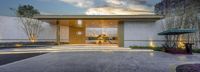 a building with a concrete entrance and stairs leading to it in the evening sun setting