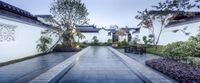 A charming walkway leads to a residential building surrounded by lush garden plants and trees. As dusk settles in, the lights come on, casting an enchanting glow. A perfect blend of nature and architecture in China.