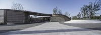 A skate park in Chongqing, China, featuring a concrete building and an arched ramp. Surrounded by trees and open space, it is a suburban oasis. The clear sky adds to the vibrant atmosphere of this Asian city.