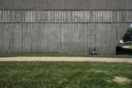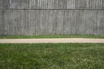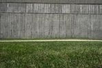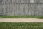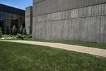 A 360-degree view of two concrete cylinders in a circular area surrounded by lush grass and trees. The architectural structures create a unique focal point in this tranquil residential area in Iowa City.