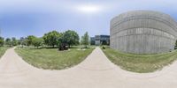 a 360 - view of two concrete cylinders in a circular area with grass and trees