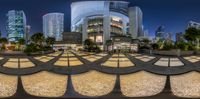 A circular courtyard surrounded by architectural buildings and trees in a vibrant city area at night. The mixed-use neighborhood offers open spaces, walkways, and urban design. An ideal location for recreation and real estate investments in Hong Kong.