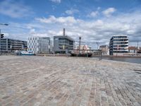 This photo showcases the architectural beauty of Bremen, Germany. The image captures a paved street near the water with several buildings in the background. The area is fenced off, creating an open space for residents and visitors to enjoy the surrounding landscape. The clear sky and modern architecture add to the charm of this city. Bremen, located in Europe, is known for its cobblestone streets, residential areas, and vibrant city life. The photo also includes a boat docked at the nearby pier, showcasing the city's harbor. This is a perfect representation of urban design and the combination of nature and modern structures.