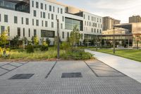 This image showcases the modern architecture of a business district in Toronto, Canada. The photo captures the straight road lined with office buildings and condominiums, creating a concrete jungle. The urban design features open spaces and green areas with grass and vegetation. The cloudy sky adds depth to the scene, while the sunlight reflects off the asphalt road surface. This picture represents the bustling city life and the urban landscape of Toronto's business district.
