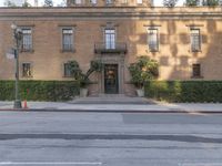 This is an image of a beautiful residential area in the city. The architecture consists of elegant mansions and houses with brick facades. The road, made of asphalt, runs through the neighborhood, creating a picturesque scene. The clear sky above casts hard shadows on the buildings, highlighting their distinct profiles. The surrounding trees add a touch of nature to the urban landscape. This photo captures the charm and elegance of a residential area in the city on a sunny day.