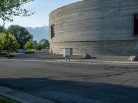A modern cityscape in Salt Lake City, Utah. The concrete walls and roads cast hard shadows in the early morning light. The urban design blends with the clear sky, showcasing the architecture of the city.