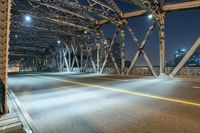 This is an image of a cityscape in Shanghai, China. The photo was taken at night, showcasing the city's architecture and urban infrastructure. The clear sky provides a backdrop for the city lights, streetlights, and the illuminated bridge. The metal beams of the bridge and the asphalt roads are contrasted with the trees lining the thoroughfare. This photo captures the vibrant and modern atmosphere of Shanghai, a bustling municipality in Asia.