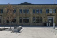 A bench sitting in front of a large brick building with many windows and an area with a sidewalk in Toronto, Canada. The modern architecture of the building blends well with the surrounding residential area. The straight road lined with trees leads to the entrance of the building, creating an inviting atmosphere. The facade of the building is made of composite material, giving it a sleek and modern look. The sidewalk is made of asphalt, and the curb is neatly designed. The public space in front of the building is adorned with beautiful flowers, adding a touch of nature to the urban setting. The clear sky above enhances the overall aesthetic of the scene. This image captures the urban design and business district of Toronto, showcasing the blend of brownstone and office buildings in this art district.