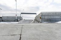 This stock photo features a modern city bridge with snow-covered ramps underneath. The open airway provides a straight-down view of the road surface, showcasing the concrete and asphalt. The image captures the urban landscape of a business district with office buildings, a stadium, and a parking lot. The grey sky adds a moody atmosphere to the scene. Perfect for illustrating themes of urban infrastructure, transportation, and modern architecture in Canada.
