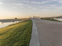 This stunning stock photo features a beautiful view of a bridge stretching across the grass fields in a city park in Milwaukee, Wisconsin. The image captures the magical atmosphere of the sunset, with the sky adorned with vibrant hues. The bridge is a key piece of infrastructure, connecting different parts of the city and providing a thoroughfare for vehicles and pedestrians alike. The path leading towards the bridge offers a serene journey through nature, with trees and grass lining the way. In the background, the calming waters of a river or lake can be seen, adding to the scenic beauty. The image perfectly showcases the urban and recreational aspects of this picturesque city in the USA.